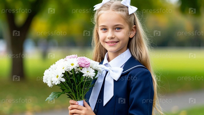 Ученица на 1 сентября в парадной школьной форме с букетом цветов