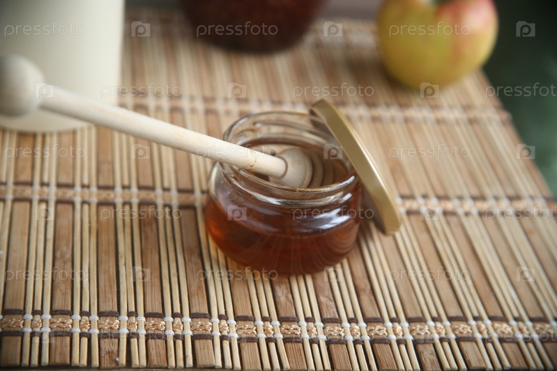 Стеклянная банка меда и деревянная мешалка на бамбуковом коврике, крупный план