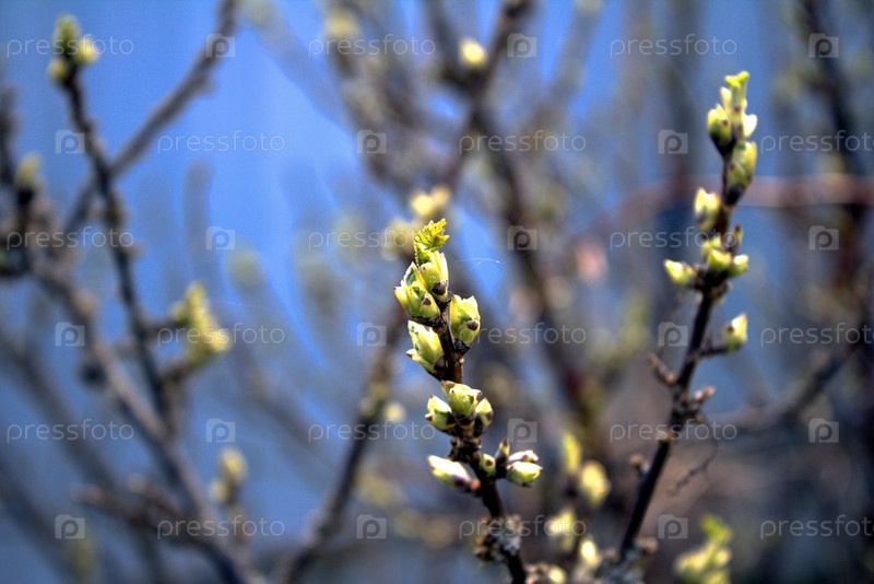 Ветка красной смородины с набухшими почками на фоне синего неба