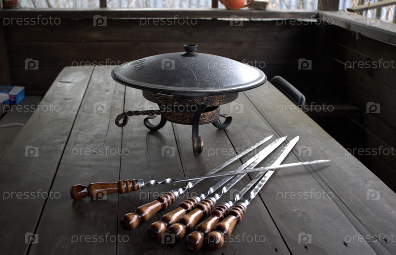 Шампуры для шашлыка и садж для приготовления еды на деревянном столе