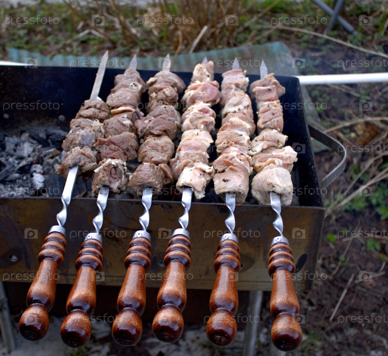 Мясо на шампурах жарится на мангале