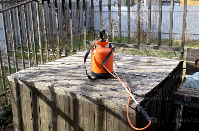 Оранжевый распылитель на деревянном столе у забора