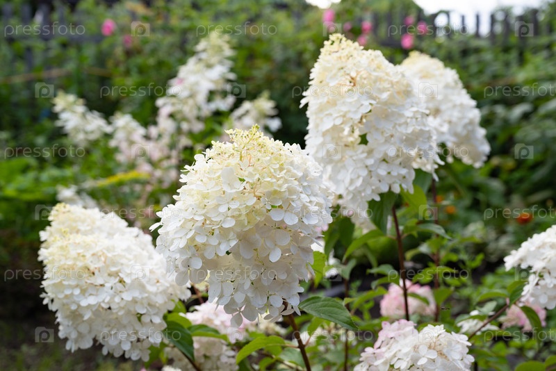 Цветы гидрензии, цветение белой гидрензии, гидрензия паникулята цветочный гидрензия, большие инфоресценции, облака цветов Красивый летний сад текстурированный шаблон