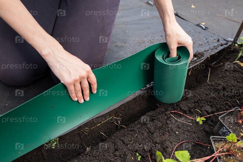 Женщина ставит пластиковый бордюр на садовую кровать в качестве забора