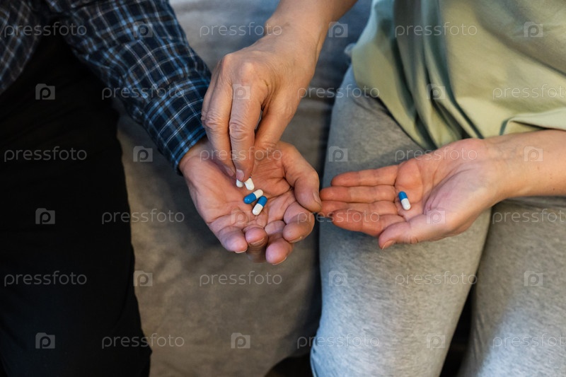 Две руки показывают смесь цветных таблеток, поскольку они участвуют в обменном моменте.Настройка расслаблена, подчеркивая важность поддержки во время обсуждения, ориентированного на здоровье