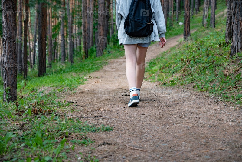 Человек, идущий по асфальтированной дорожке через лес с высокими деревьями
