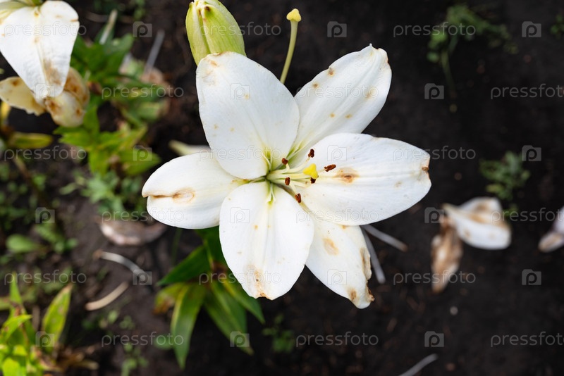 лилии цветут в оживленном саду летом, демонстрируя нежные лепестки и пышную зеленую листву, которая улучшает их красоту