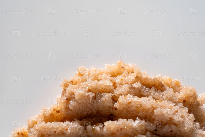 Макро снимки брюневого сахарного скраба для тела с ароматическими частицами янтаря и бобов тонка. богатая, зернистая эксфолирующая текстура с глубокими тенями и яркими выделениями