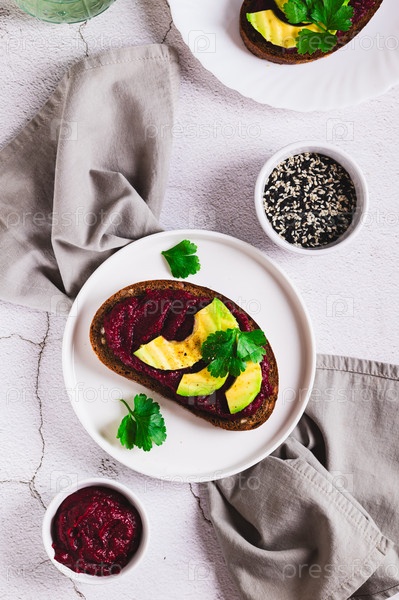 Тосты с домашним вегетарианским свекольным хумусом на тарелке на столе и вертикальный вид