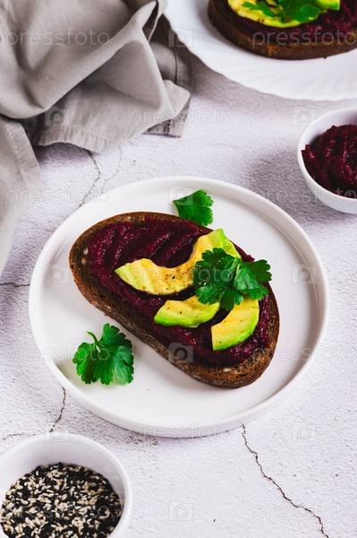 Тосты с домашним вегетарианским свекольным хумусом на тарелке на столе вертикальный вид