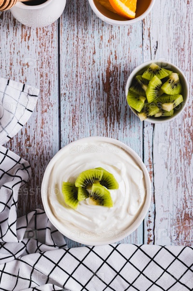 Скайр, молочный продукт с высоким содержанием белка и фрукты в миске на столе и вертикальный вид
