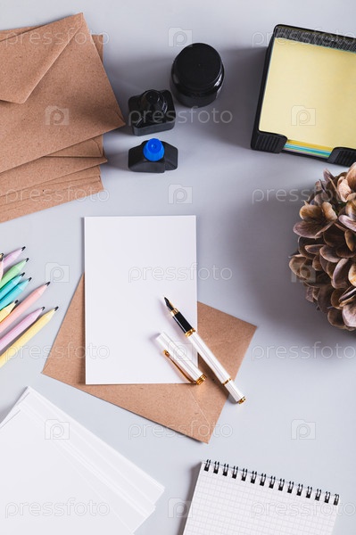Концепция аккуратного почерка с помощью чернил и ручки, письменные принадлежности верхний и вертикальный вид