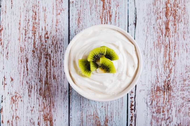 Ближайшее изображение густого ферментированного обезжиренного молочного продукта с пробиотиками и киви в миске на столе верхний вид