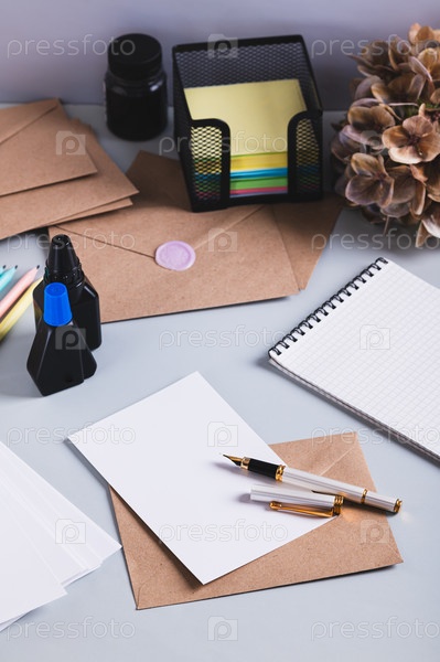 Концепция аккуратного почерка с помощью чернил и ручки, письменные принадлежности на столе вертикальный вид