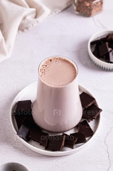 Уютный горячий шоколад в стакане и сладости на тарелке на столе вертикальный вид