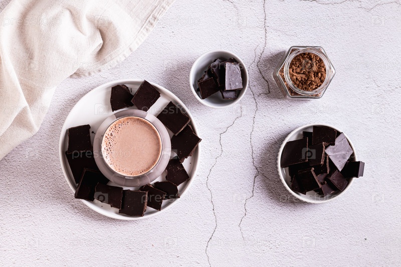 Теплый напиток с какао в стакане и шоколад на тарелке на столе