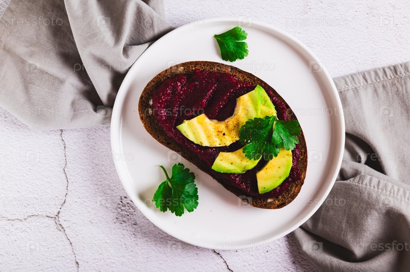 Близкий снимок свекольного хумуса и авокадо на ржаном хлебе на тарелке на столе