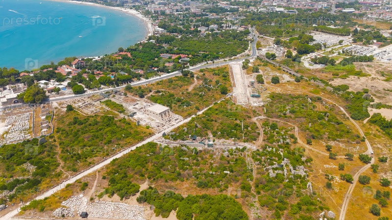 Сид, Манавгат, Турция.Древняя византийская больница, археологический участок Колоннированной дороги, панорамный взгляд с воздуха на раскопки в древнем городе в летний день
