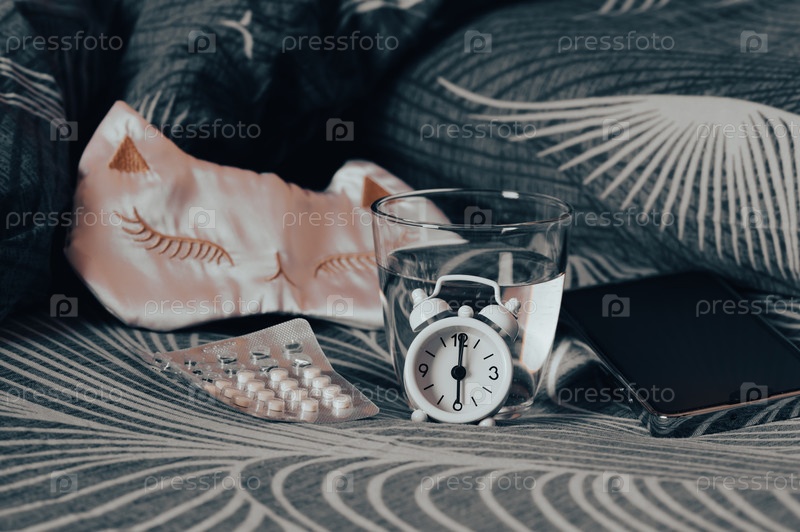 Снотворные, стакан воды, маска и будильник на кровати