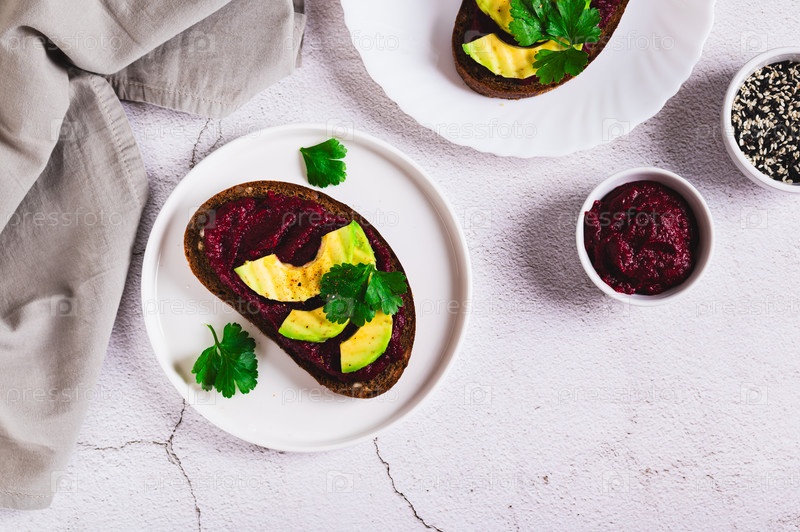 Хуммус из свеклы и авокадо на ржаном хлебе на тарелке на столе