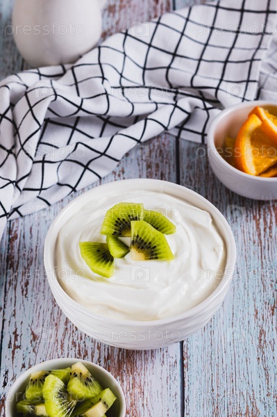 Скайр, молочный продукт с высоким содержанием белка и фрукты в миске на столе вертикальный вид