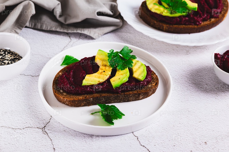 Тосты с домашним вегетарианским свекольным хумусом на тарелке за столом