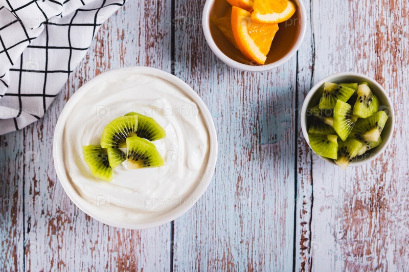 Густой ферментированный продукт из обезжиренного молока с пробиотиками и киви в миске на столе