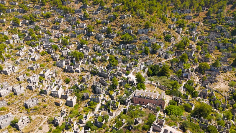 Обширный вид с беспилотного летательного аппарата на древний город-призрак Кармиласса Руины на склонах гор, заброшенная греческая православная деревня с двумя церквями недалеко от побережья Олудениза.. Aerial View