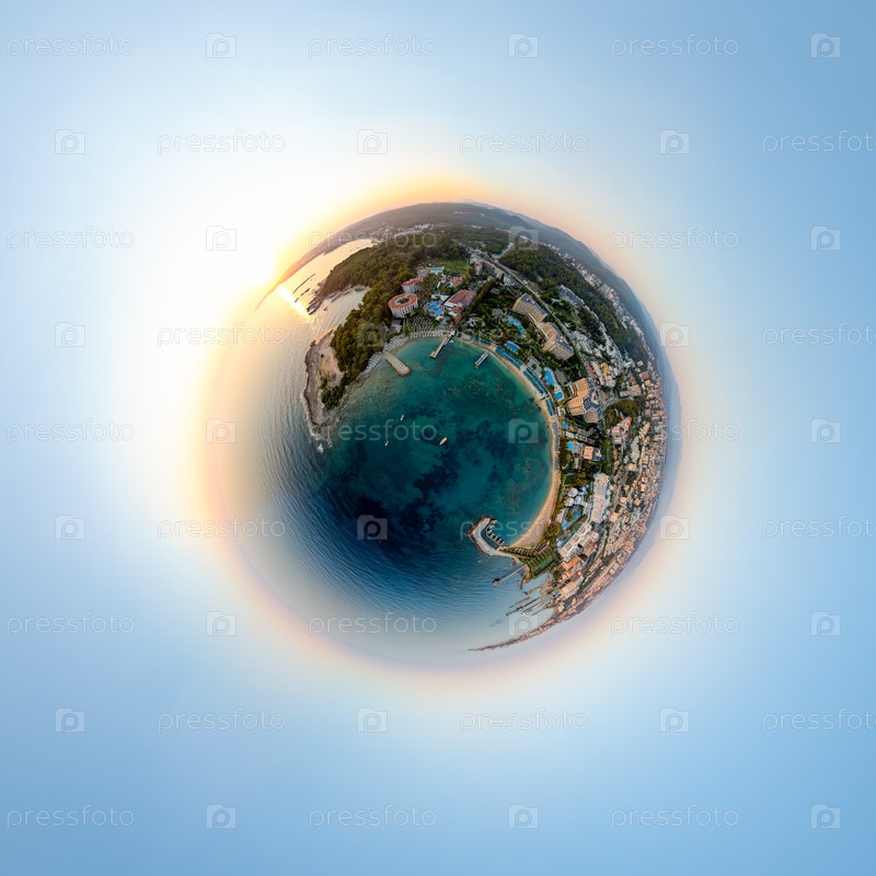 Авсаллар, Аланья, Турция.Маленькая планета взгляд с воздуха на средиземноморскую береговую линию, где сосновые леса встречаются с бирюзовой лагуной и горы окружают горизонт.Панорамный астероид 360 градусов