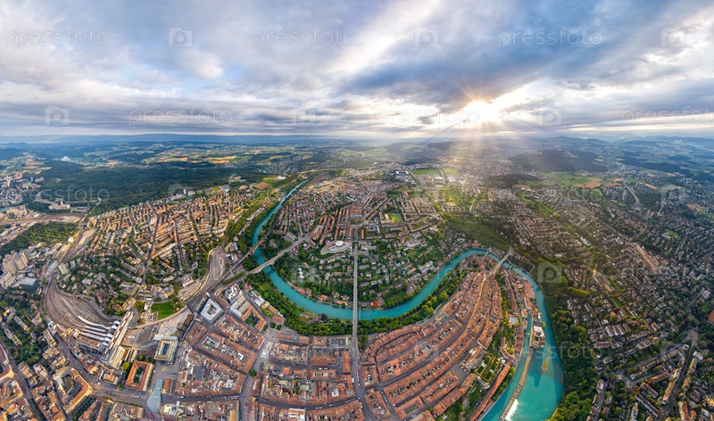 Берн, Швейцария.Панорама города в пасмурную погоду.Солнечные лучи.Летнее утро.Вид с воздуха