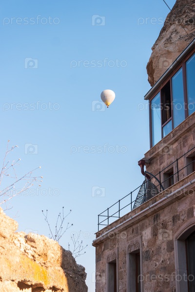 Гореме, Невшехир, Турция.Горячий воздушный шар плавает в ясном голубом небе над деревенским каменным зданием с большими окнами и металлическим перилом, со скалистым обрывом слева, освещенным дневным светом