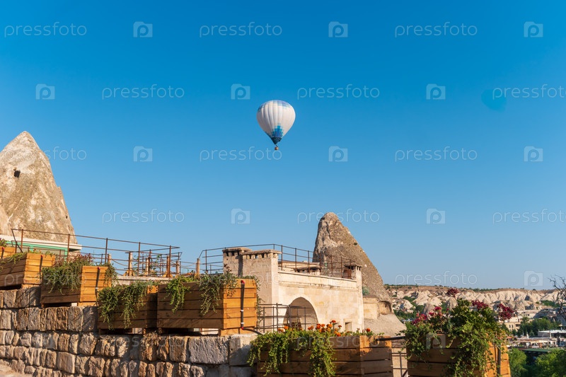 Серенный пейзаж с воздушным шаром, плавающим над сказочными дымоходами и каменистой местностью, включая каменное сооружение с деревянными саженцами ярких цветов и зелени