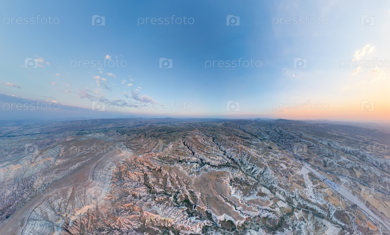 Широкий снимок плато Каппадокии, расположенного над платообразованием, освещенный мягким розовым светом заката солнца под голубым небом, украшенным облаками на дальнем горизонте