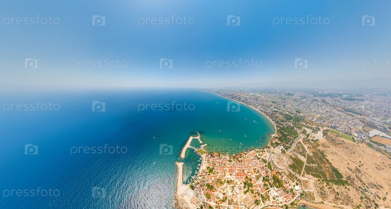 Широкая воздушная панорама, контрастирующая с древними руинами и современным городским развитием вдоль берега Средиземного моря в солнечный день