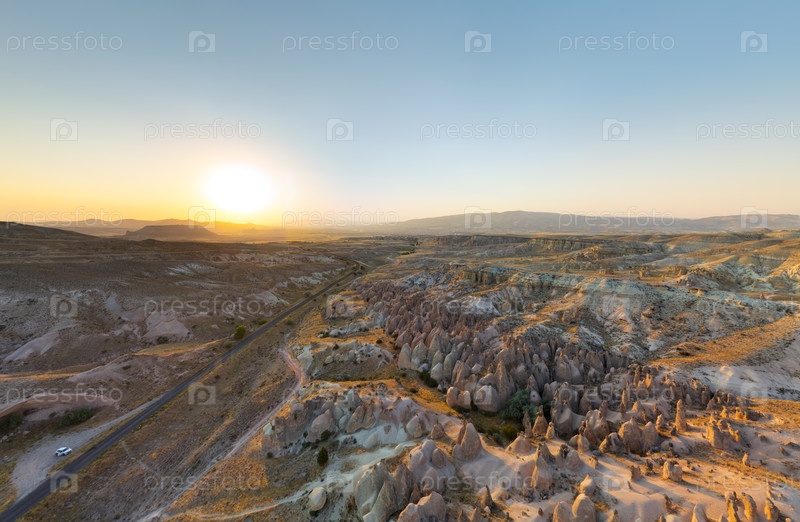 Гореме, Невшехир, Турция.Деврентская долина подчеркивает текстурированную вулканическую местность, разбросанные скальные скульптуры и извилистую дорогу, освещенную теплым золотистым светом заходящего солнца.Вид с воздуха