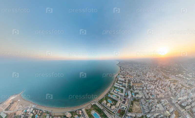 Мерсин, Турция. обширный взгляд с воздуха на жилой район Мезитли с бассейнами. современные многоквартирные дома, Средиземное море и горы Тельца в золотое время суток