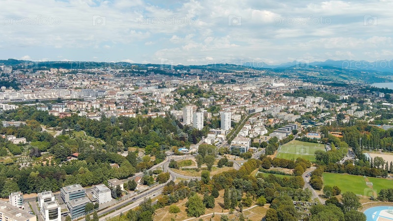 Лозанна, Швейцария.Панорама города и вид на город с набережной.Расположен на берегу Женевского озера.Летний день, Aerial View