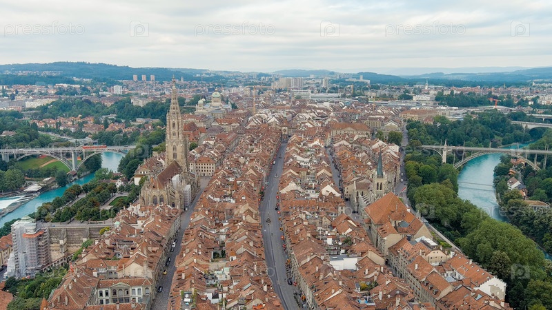 Берн, Швейцария. Знаменитая башня Zytglogge. Панорама города с видом на исторический центр. Летнее утро, Aerial View