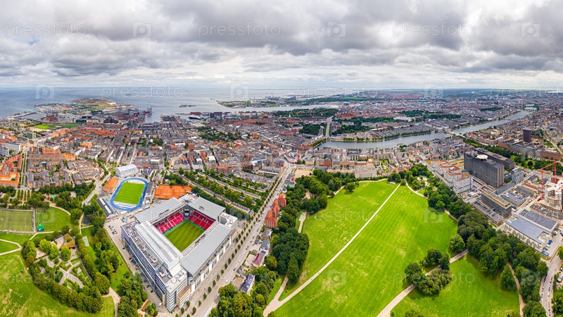 Копенгаген, Дания. Панорама города летом. Облачная погода. Вид с воздуха
