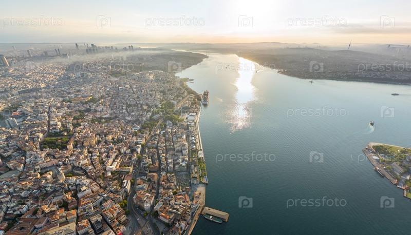 Панорама Босфорского пролива с воздуха, мост мучеников 15 июля соединяющий европейские и азиатские берега, круизный корабль на пирсе, золотой солнечный свет блестит по воде