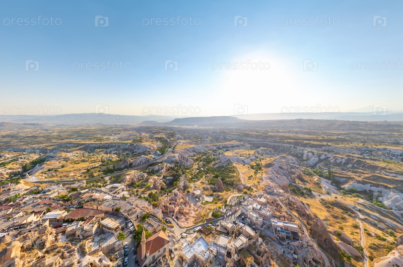 Учисар, Невшехир, Турция. обширная воздушная панорама поселения Учисар с окружающими долинами, сказочными дымоходами и отдаленными плато в ясном утреннем свете