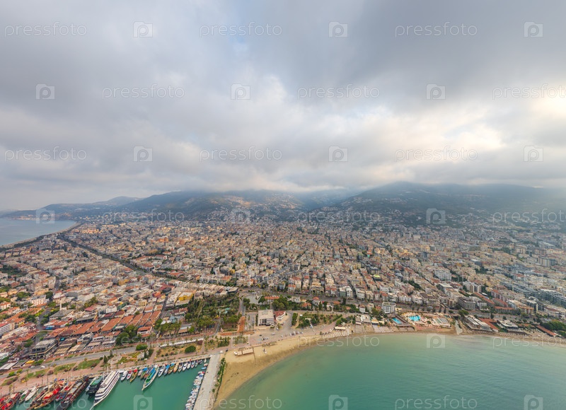 Вид с воздуха на марину, городской пляж и городскую береговую линию под облачным летним небом