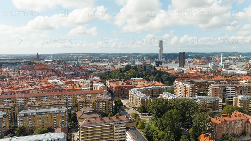 Гетеборг, Швеция. Skansen Kronan - крепость на холме с панорамным видом на город. Панорама города. Летний день. Облачная погода, Aerial View