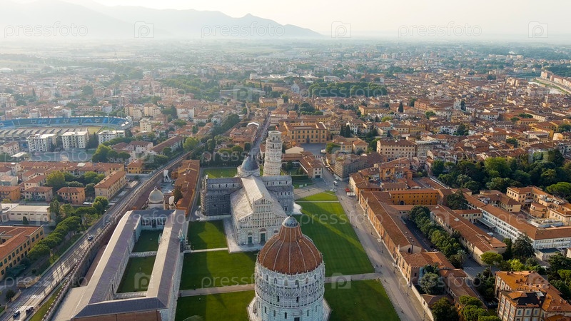 Пиза, Италия. Знаменитая наклонная башня и пизанский собор в Пьяцце деи Мираколи. Лето. Утренние часы, вид с воздуха