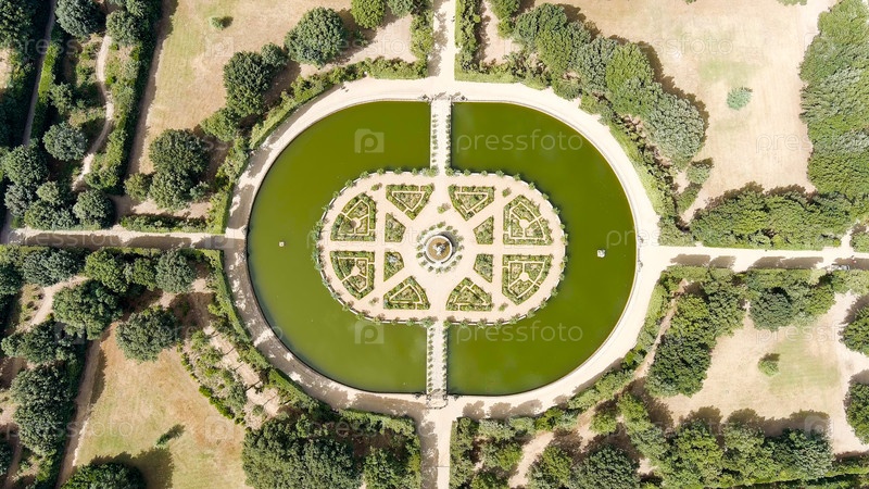 Флоренция, Италия. Палаццо Питти - Королевский дворец эпохи Возрождения. Сады Боболи (Giardino di Boboli) - Классический сад XVI-XVII веков. Летом вид с воздуха