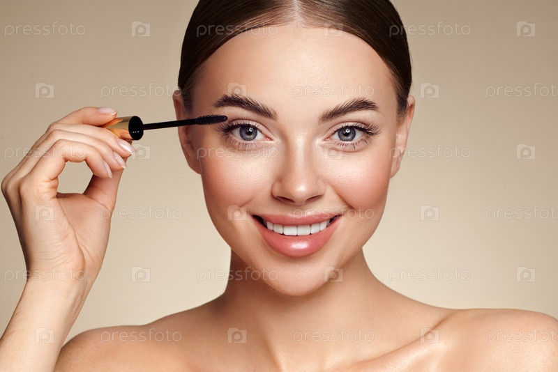 Женщина красоты наносит черную маскару на ресницы
