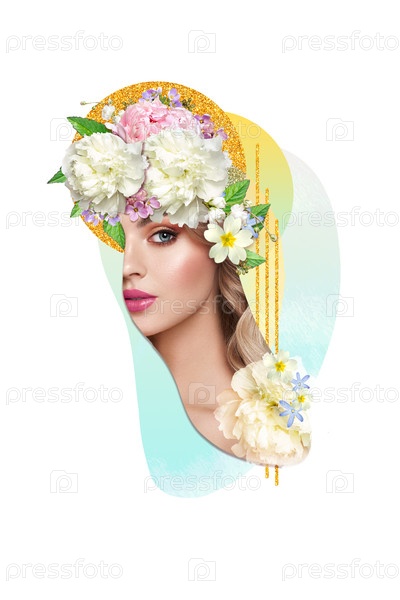 Абстрактный художественный коллаж молодой красивой женщины с цветами на голове
