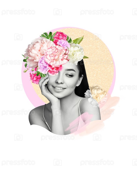 Абстрактный художественный коллаж молодой красивой женщины с цветами на голове