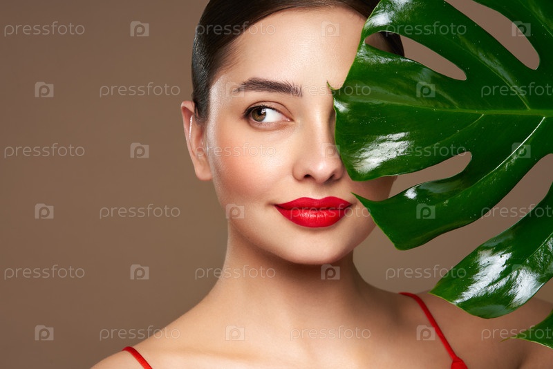 Ближайшее лицо женщины с зеленым экзотическим листом