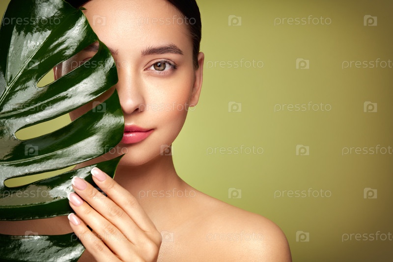 Ближайшее лицо женщины с зеленым экзотическим листом